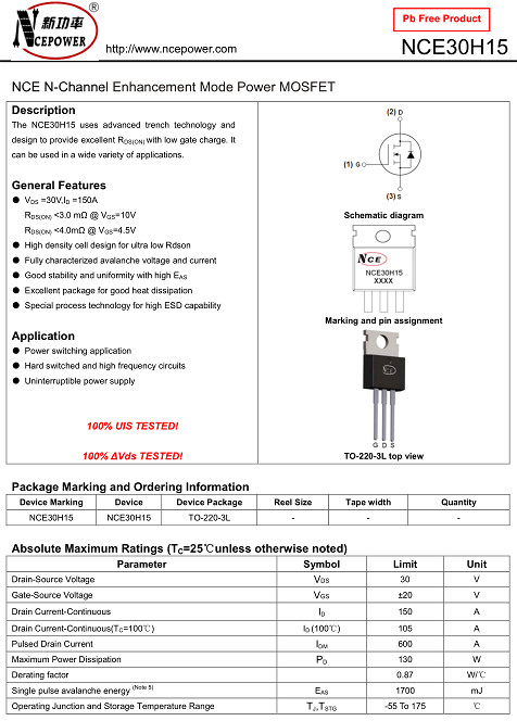 新潔能 NCE30H15 MOS管產(chǎn)品信息|PDF資料|NCE30H15封裝等-KIA MOS管