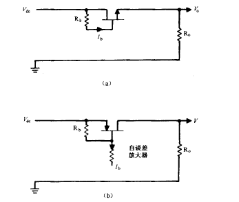 圖1.3 (a)串接NPN型晶體管的線性調整器。若基極驅動由Vd,經Rb提供,則網壓輸入對應的紋波谷值電壓與輸出電壓間必須存在最小壓差以保證向內的基極驅動電流。(b)串接PNP型晶體管的線性調整器。使用PNP型晶體管時,所需基極電流不是取自Vd。,而是由基極向外流入電流放大器。Vd。不必比Va高2.5V,最小壓差可以是0.5~I.OV串接PNP型晶體管的集成線性調整器現市場上有售,但價格很高。就集成電路制造工藝而言,在同樣芯片上集成較大電流的PNP型晶體管比集成較小電流的NPN型晶體管更困難。