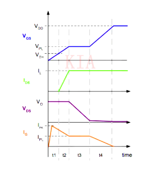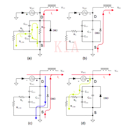 圖3表示在MOSFET導通過程的各個時間間隔內激活的柵極電流路徑。
