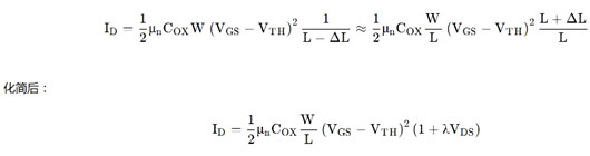 當MOS管進入飽和區后,輸出電流并不是水平線,而是存在一定的傾斜。這是由于導電溝道產生夾斷,有效溝道長度變短。