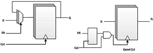 通過用EN信號控制時鐘信號的開關,在EN信號無效時,寄存器的時鐘端將保持一個定值,D端的數值將不能傳到Q端。