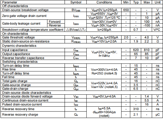 6n65場效應管漏極電流5.5A,漏源擊穿電壓為650V,RDS(ON)=1.9Ω @ VGS=10V;具有低柵極電荷,典型值為16nC,為電路設計提供了更多的靈活性;高堅固性,能夠在各種環境條件下可靠工作,確保設備的穩定性和可靠性;以及快速切換能力,能夠帶來更高的效率和更快的響應速度;指定雪崩能量,保證在高壓下的可靠性和穩定性;改進的dv/dt能力使得它在高速開關應用中表現出色,能夠有效減少電路中的噪音和干擾,可以保證其穩定可靠的性能。