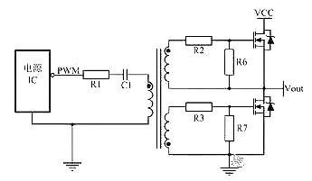 為了滿足如圖 5所示高端MOS管的驅(qū)動,經(jīng)常會采用變壓器驅(qū)動,有時為了滿足安全隔離也使用變壓器驅(qū)動。其中R1目的是抑制PCB板上寄生的電感與C1形成LC振蕩,C1的目的是隔開直流,通過交流,同時也能防止磁芯飽和。