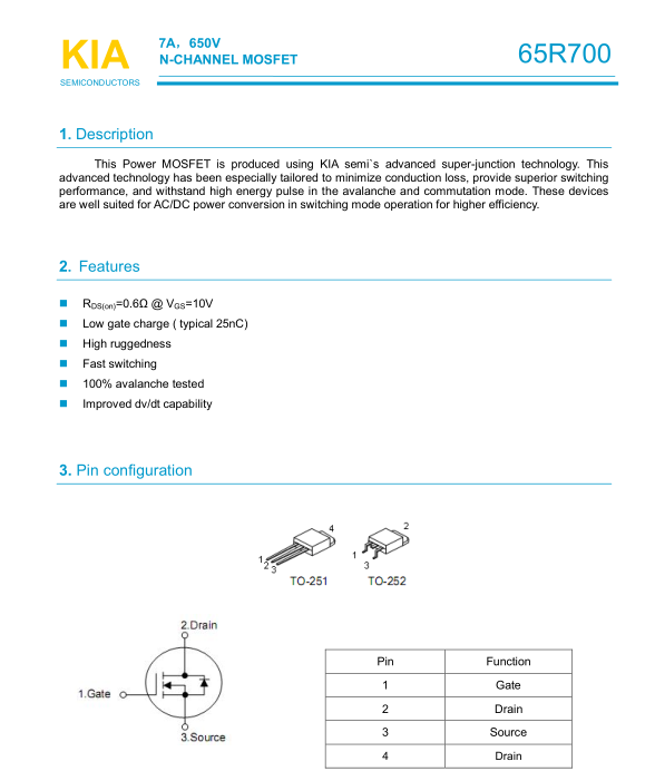 參數: ID(A): 7 BVDSS(V): 650 RDS(ON): 0.6 Qg(nC): 8 Package: TO-251、252、220F